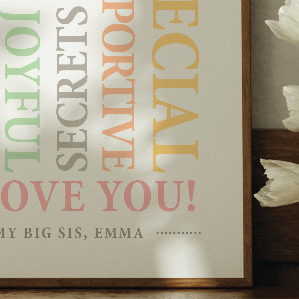 Whether she’s your sister by birth or the best friend who became family, this personalized soul sister gift is a beautiful way to say "I'm glad you're in my life." Unlike generic store-bought items, this custom wall art features elegant, minimalist typography that she can proudly display in her home or office.